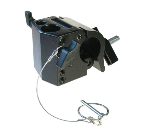 An aluminium clamp with a high tensile extruded aluminium lid that is suitable for 48mm to 51mm diameter tubes and is 50mm wide designed to accept a 28mm or 16mm spigot. Supplied with lynch pin for secondary locking, this Clamp is designed predominantly for use in the TV/Film industry and is often used with Drop Arms and Pantographs. Available in polished Silver or powder coated Black.