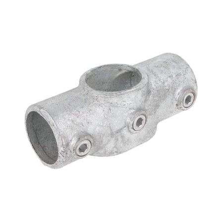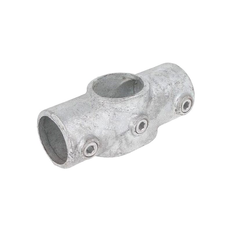 A galvanised steel fitting designed to provide a cross joint between a vertical and two horizontal tubes freely adjustable between 4 and 10 degrees.