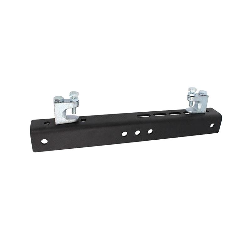 A steel adjustable girder clamp supplied fitted with two lindapter flange clamps. Ideal for use with stud drops or with a shackle and wire ropes. Two sizes are available with a range of 12mm holes for fixings. One suitable for 75mm to 150mm and one for 150mm to 300mm girders.  Suitable for girder thickness of 3mm to 24mm.