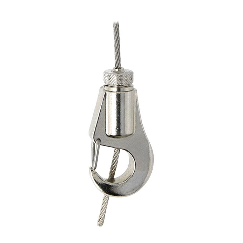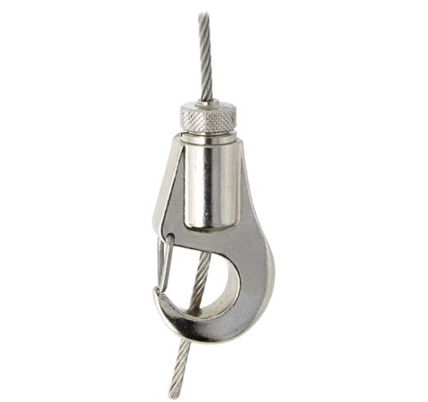 A Type 30SV Reutlinger Cable Holder fitted with a hook. Suitable for Ø2mm & Ø3mm steel wire rope these cable holders have been specifically designed for applications which demand compliance with BGV C1, such as stage productions, fair booths, etc.