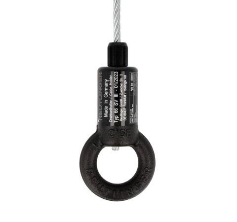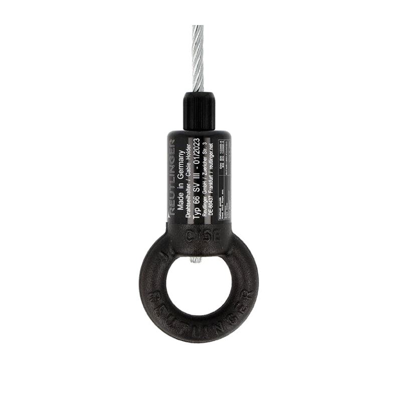 A Type 66SV Reutlinger Cable Holder with a ring. Suitable for 6mm steel wire rope these cable holders have been specifically designed for applications which demand compliance with BGV C1, such as stage productions, fair booths, etc.