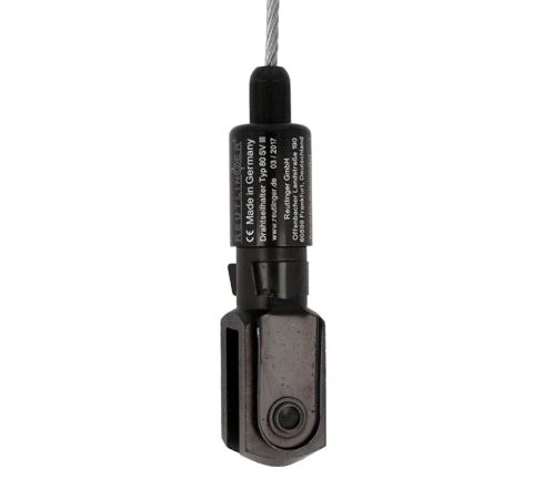 A Type 80SV Reutlinger Cable Holder with a fork. Suitable for 6 and 8mm steel wire rope these cable holders have been specifically designed for applications which demand compliance with BGV C1, such as stage productions, fair booths, etc.