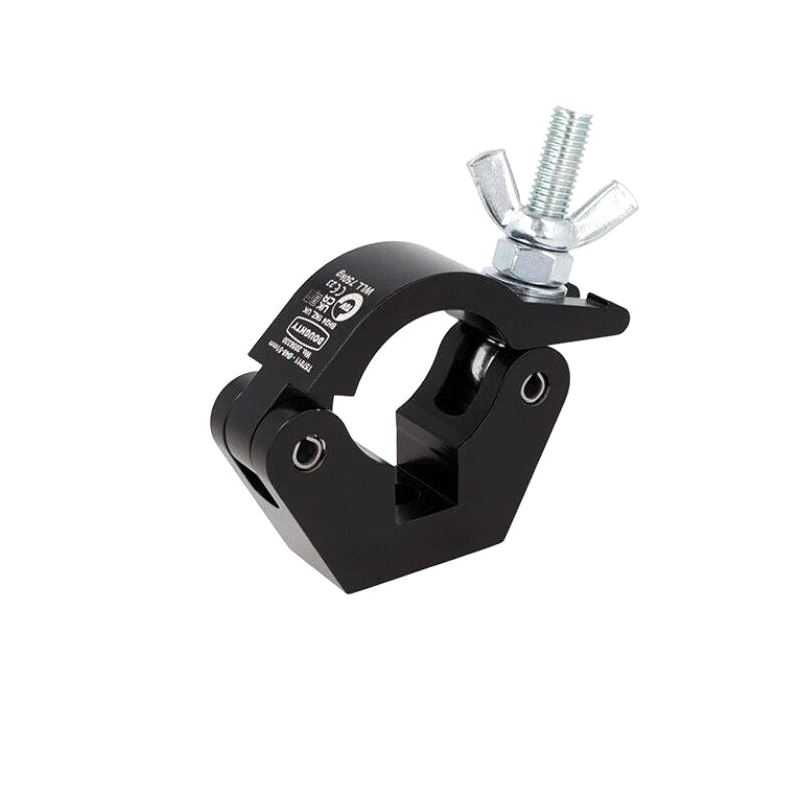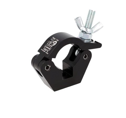 The industry standard slimline half coupler. A high tensile extruded aluminium clamp that is suitable for 48mm to 51mm diameter tubes. It has a WLL of 750Kg and is 30mm wide. Slotted to hold captive an M12 nut or bolt head. Ideal for trussing as it will not damage the cords.