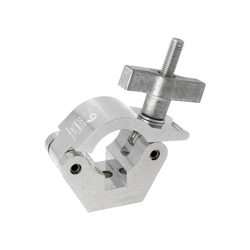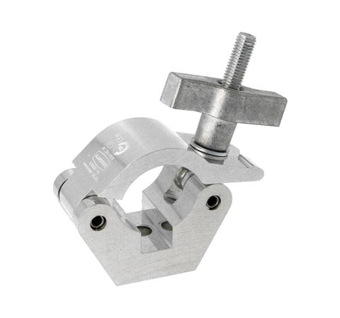 The industry standard half coupler with a large Easy Grip knob. A high tensile extruded aluminium clamp that is suitable for 48mm to 51mm diameter tubes designed to be used without the need for tools. It has a WLL of 750Kg and is 50mm wide. Slotted to hold captive an M12 nut or bolt head. Ideal for trussing as it will not damage the cords.