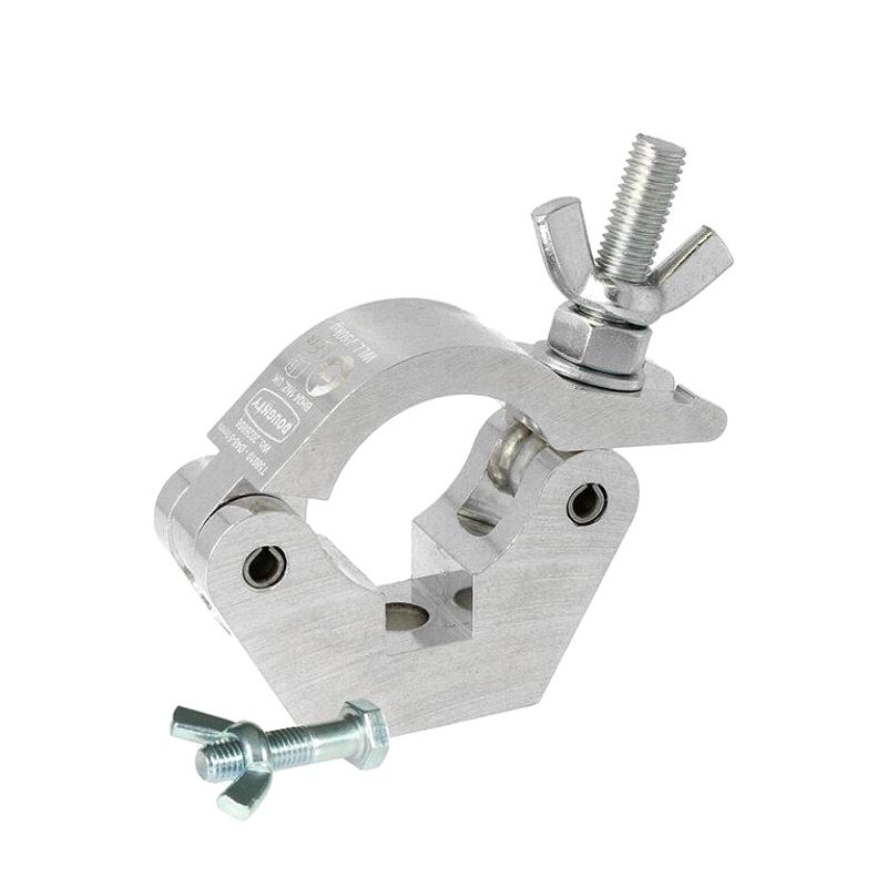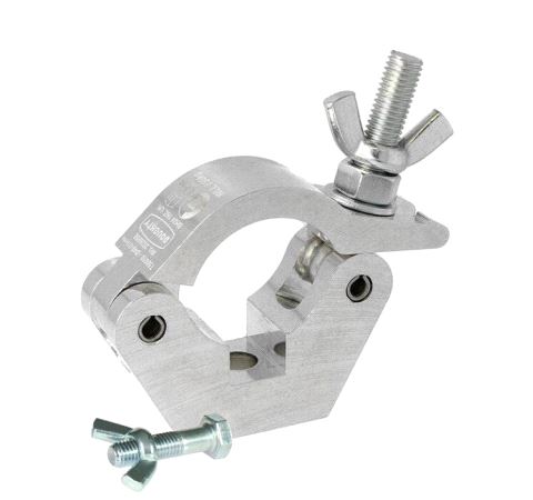 The industry standard slimline half coupler. A high tensile extruded aluminium clamp that is suitable for 48mm to 51mm diameter tubes. It has a WLL of 750Kg and is 30mm wide. Slotted to hold captive an M12 nut or bolt head and supplied with an M12 X 45 bolt and wing nut. Ideal for trussing as it will not damage the cords.