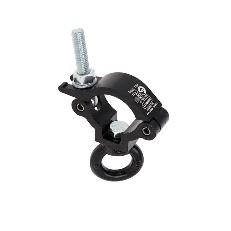 A high tensile extruded aluminium clamp that is suitable for 48mm to 51mm diameter tubes. It has a WLL of 300Kg and is 30mm wide factory fitted with an Eye Nut. Ideal for trussing as it will not damage the cords.