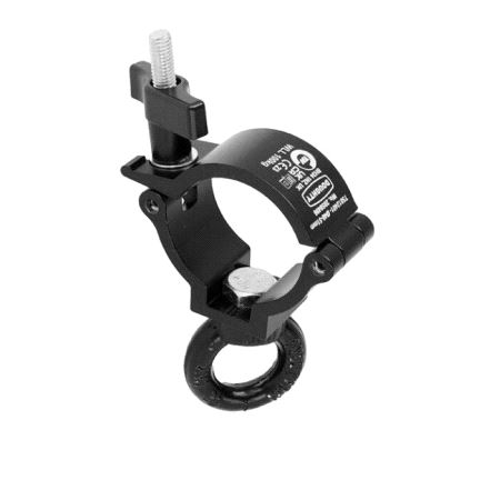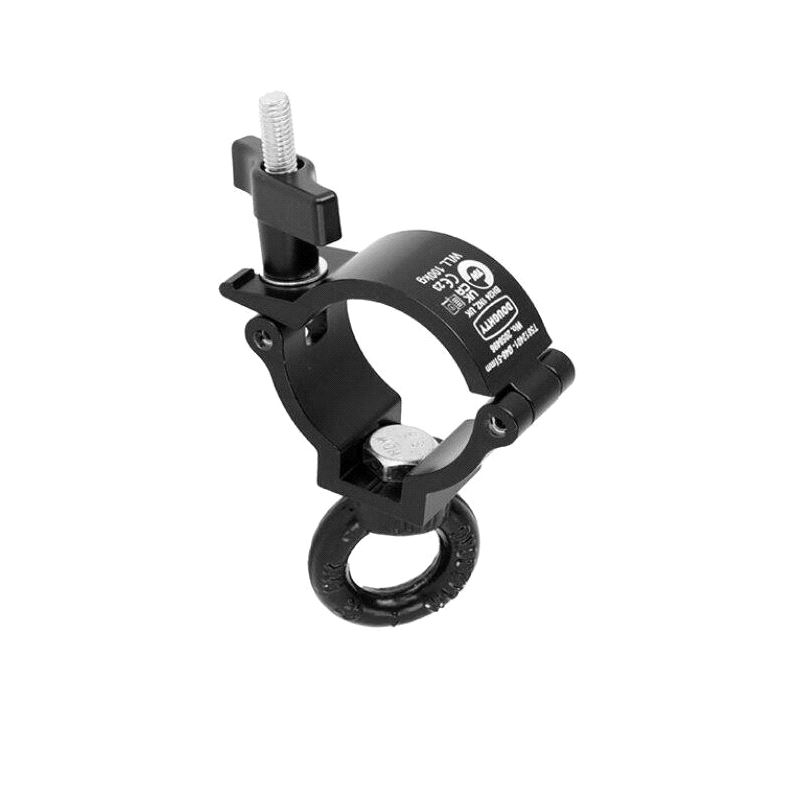 A high tensile extruded aluminium clamp that is suitable for 48mm to 51mm diameter tubes. It has a WLL of 100Kg and is 30mm wide factory fitted with an Eye Nut. Ideal for trussing as it will not damage the cords.