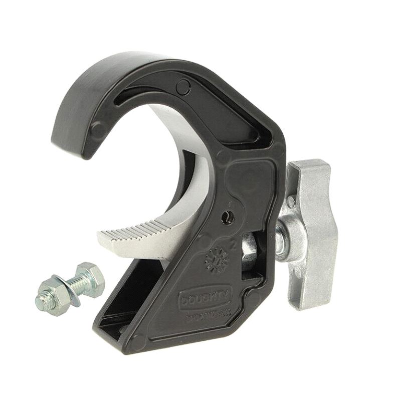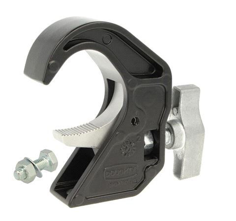 An innovative pressure die cast aluminium clamp that is suitable for 38mm to 51mm diameter tubes. It has a WLL of 50Kg and is 30mm wide. Slotted to hold captive an M10 nut or bolt head. Ideal for use with lightweight lanterns on trussing as it will not damage the cords. The perfect replacement for old style steel hook clamps. Available powder coated black.