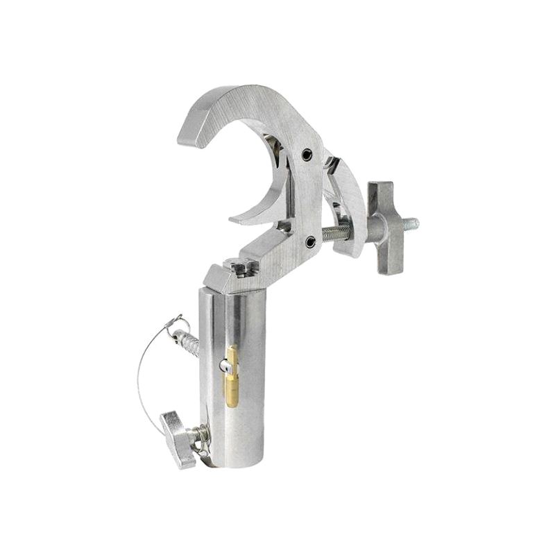 A high tensile extruded aluminium quick trigger clamp that is suitable for 48mm to 80mm diameter tubes. It has a WLL of 100Kg and is 30mm wide factory fitted with a 29mm Spigot receiver designed to accept a 28mm diameter spigot. Supplied with lynch pin for secondary locking allowing 360 degree rotation, this clamp is designed predominantly for use in the TV/Film industry and is often used with Drop Arms and Pantographs.