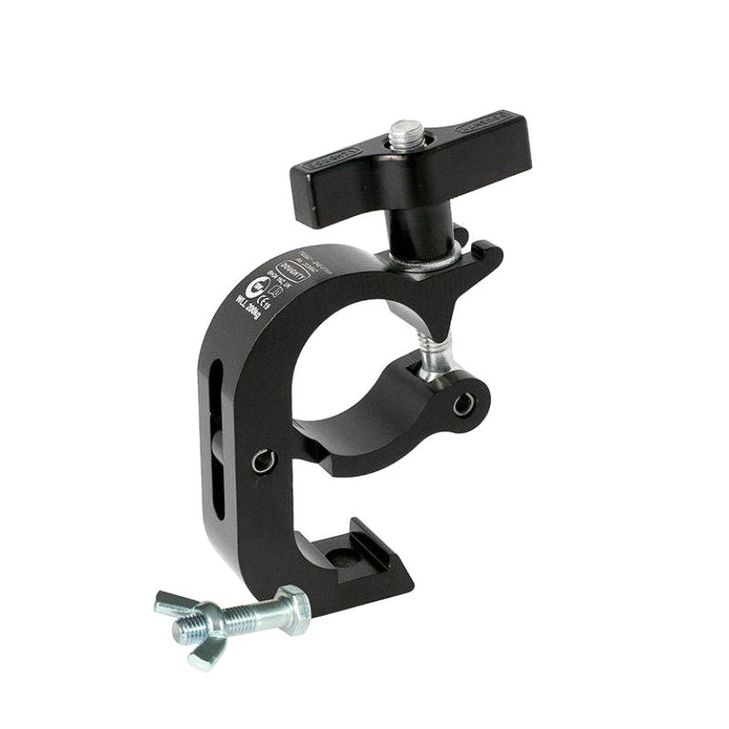 A high tensile extruded aluminium trigger clamp that is suitable for 48mm to 51mm diameter tubes. Has a WLL of 200Kg and is 30mm wide. Slotted to hold captive an M12 nut or bolt head and supplied with an M12 X 45 bolt and wing nut. Ideal for hanging large moving heads on trussing as it will not damage the cords. Available in polished Silver or powder coated Black.