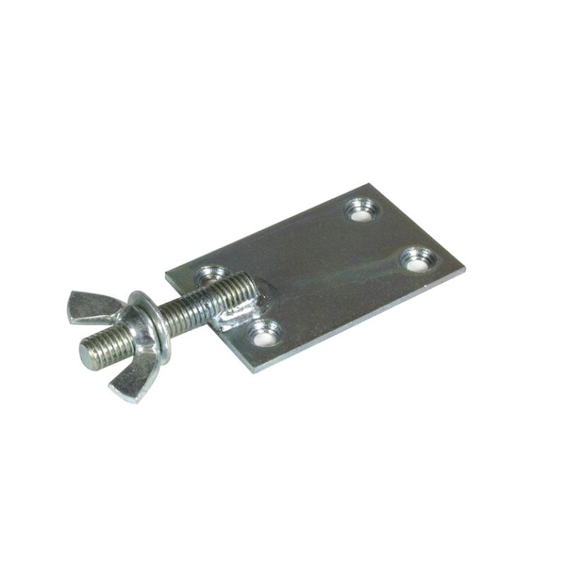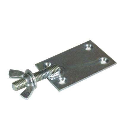 A mild steel plate, with BZP finish, and an M10 stud welded to the side. Supplied with an M10 wing nut. Designed to be used bolted to timber with 4 X countersunk 6mm machine screws, nuts and washers. Always remember, the bracket is only as strong as the weakest part of the assembly which in this case is the timber.