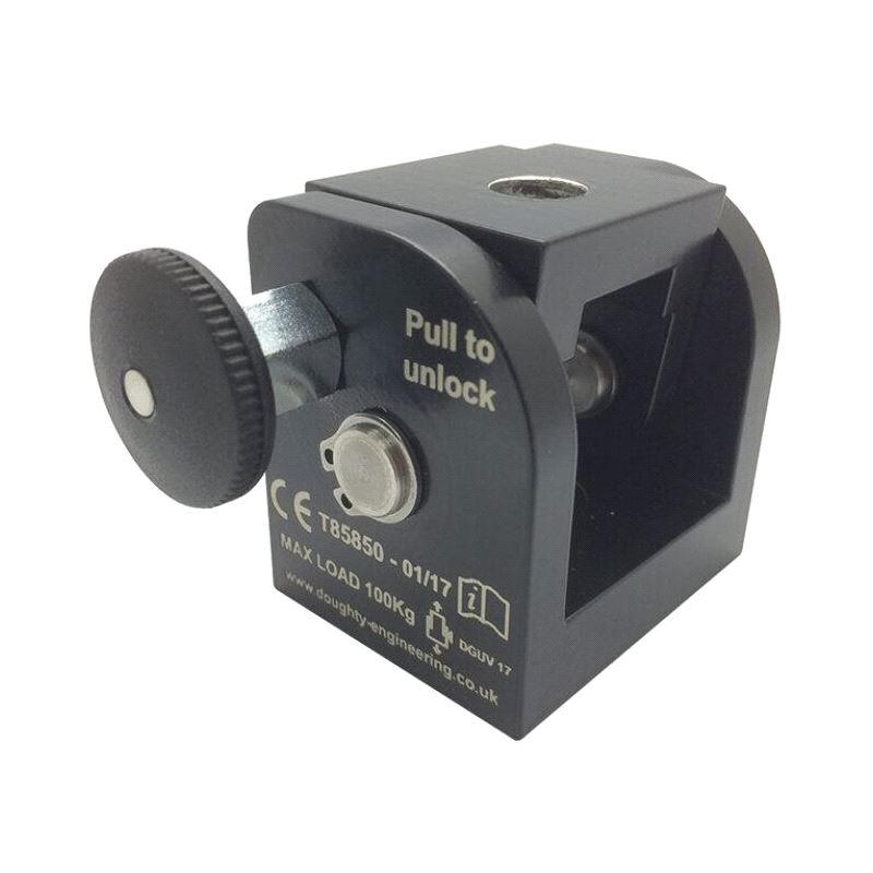 The Space Saver enables a clamp or spigot to be permanently fitted to a luminaire or projector etc and folded into a storage position to save space and time. The clamps etc are not lost because they stay on the luminaire.