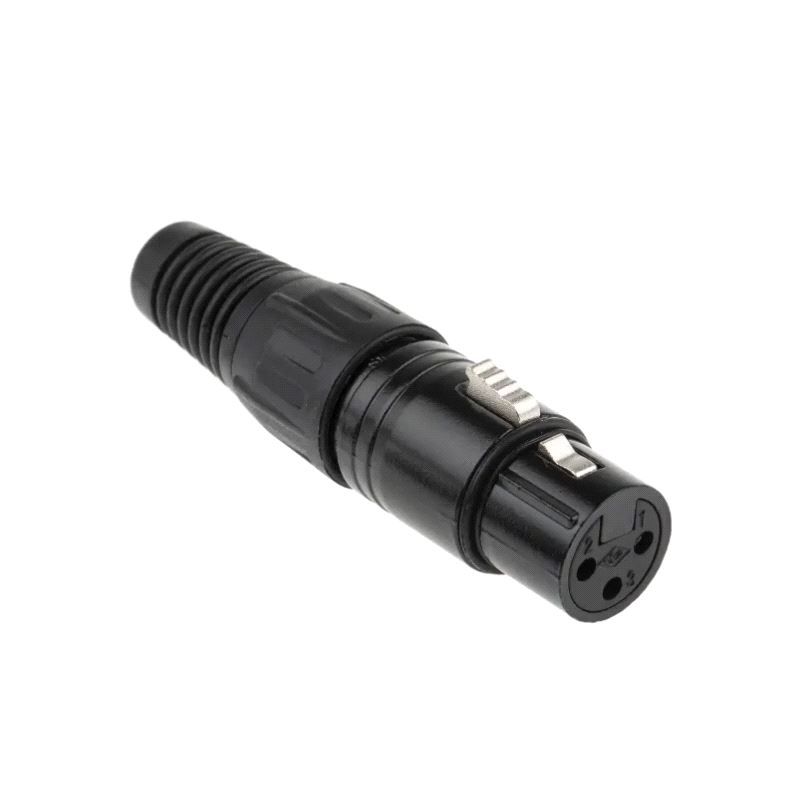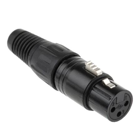 3 pole female cable connector with black metal housing and gold contacts.