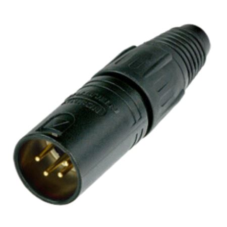 4 pole male cable connector with black metal housing and gold contacts.