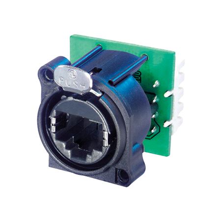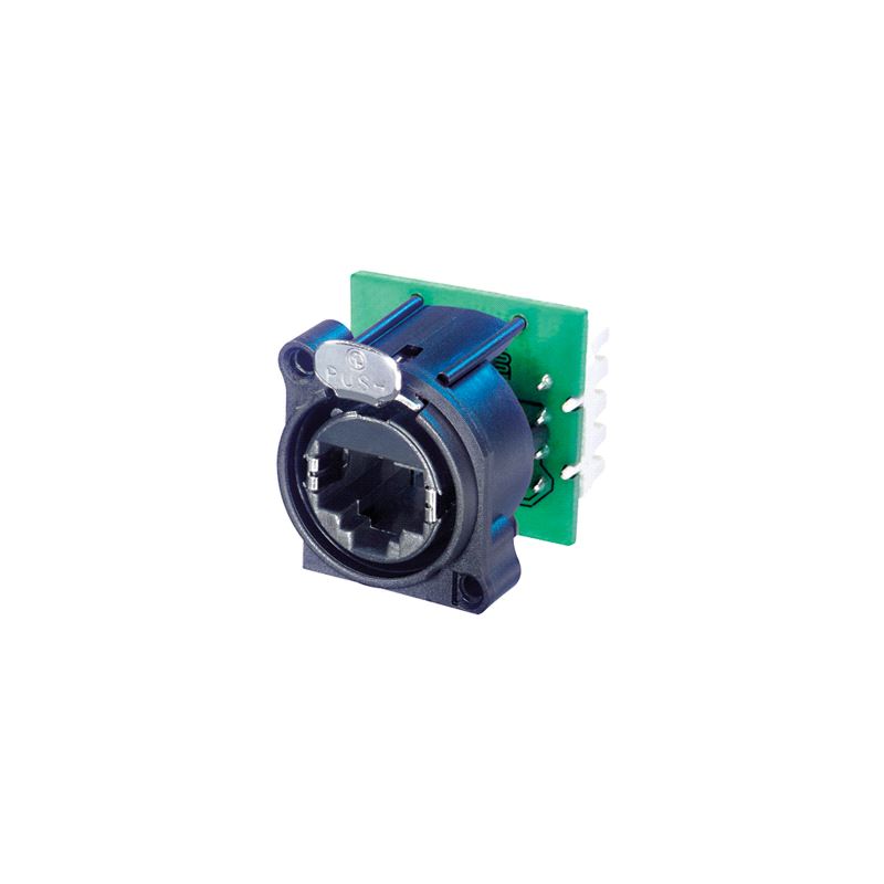 The etherCON Series is a ruggedized and lockable RJ45 connector system, optimized for pro audio, video and lightning network applications. The chassis connectors are shaped to fit into standardized panels out of the entertainment industry.
