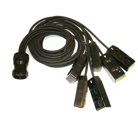 Uttaksforgreining (ut til lyskastere) fra en original Socapex 19 pin kontakt til 6 x 2.5mm2 lengder á 0,66=>4,0m med doble Schuko kontakter i enden. Leveres med krympestrømper for merking.